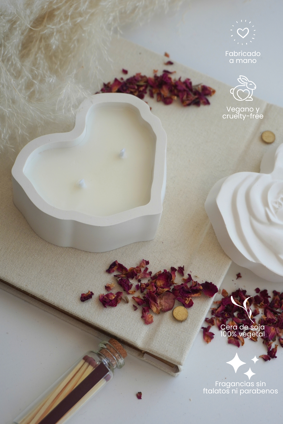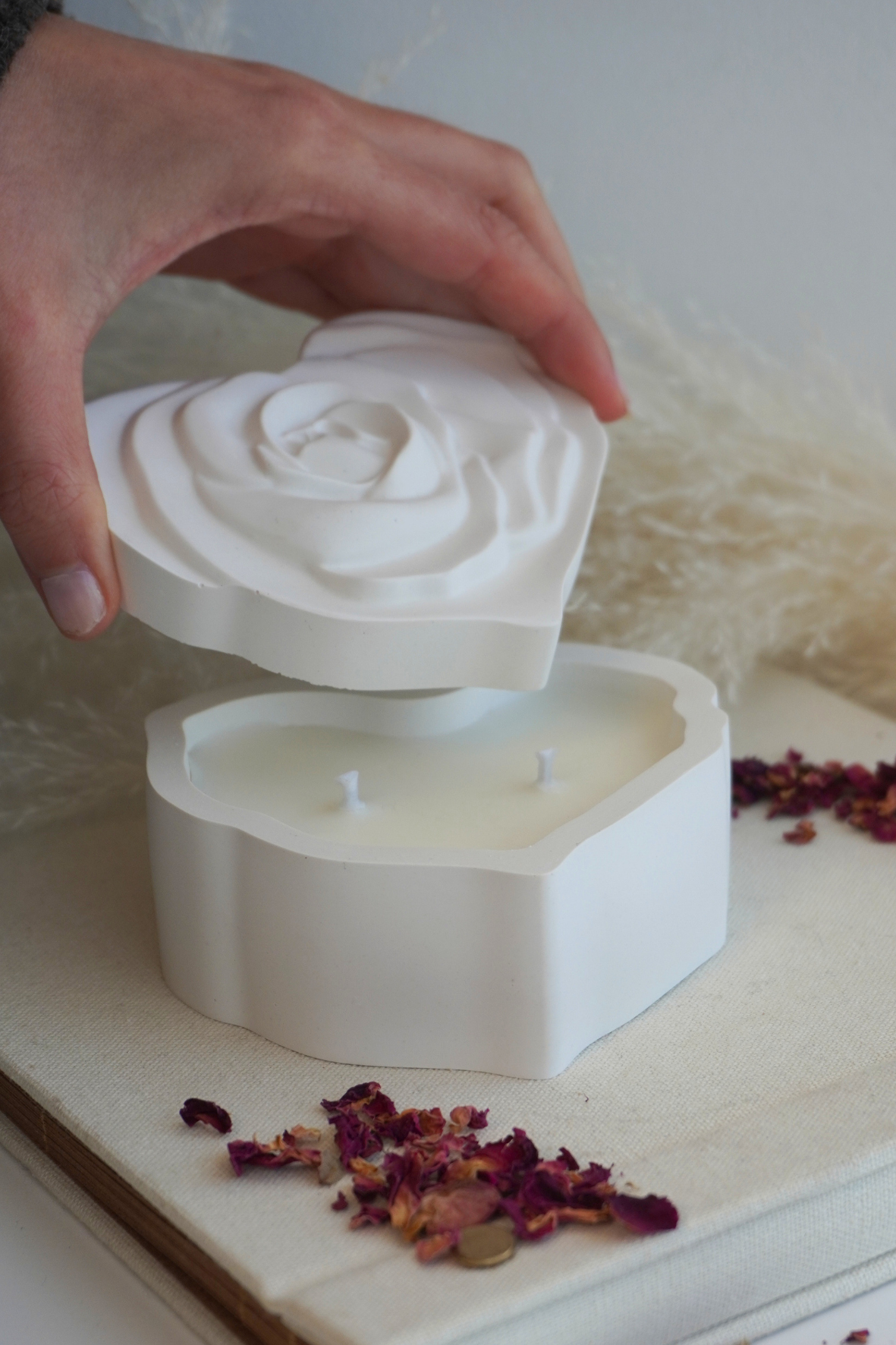 Su recipiente en forma de corazón, fabricado a mano, cuenta con una tapa que simula los pétalos de una rosa, convirtiéndola en una pieza única.